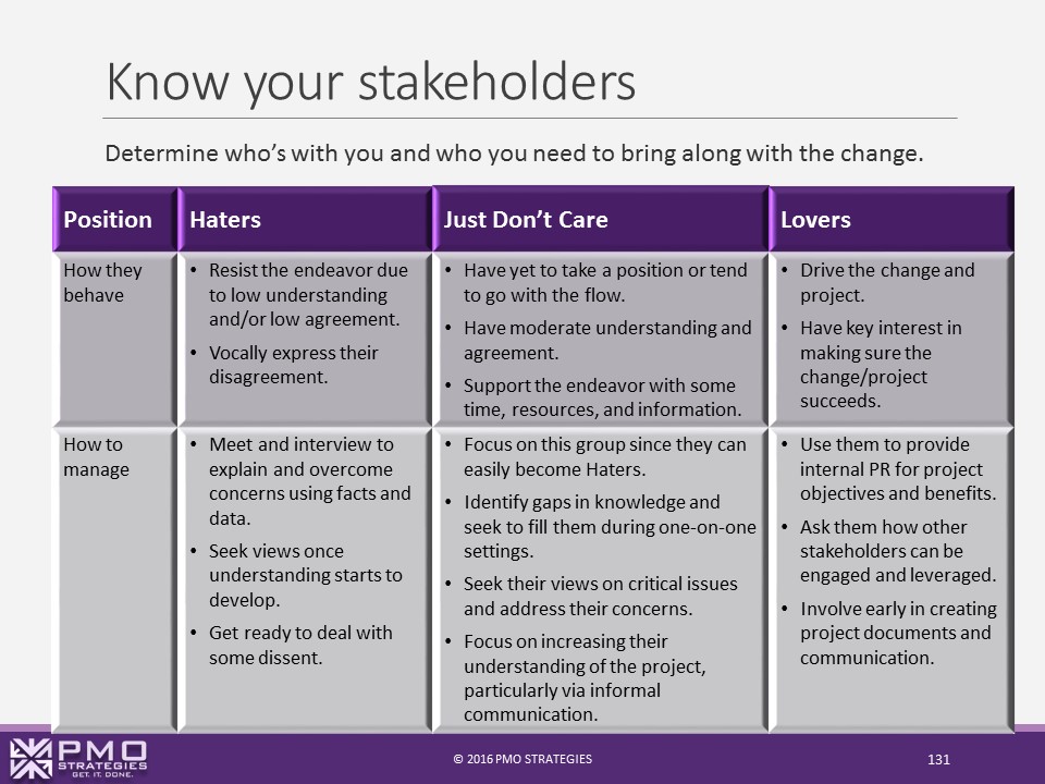 - Support: Is the stakeholder a supporter of the project? Neutral? A resister? Label supporters with green sticky notes, resisters with red notes, and the rest with a third color.